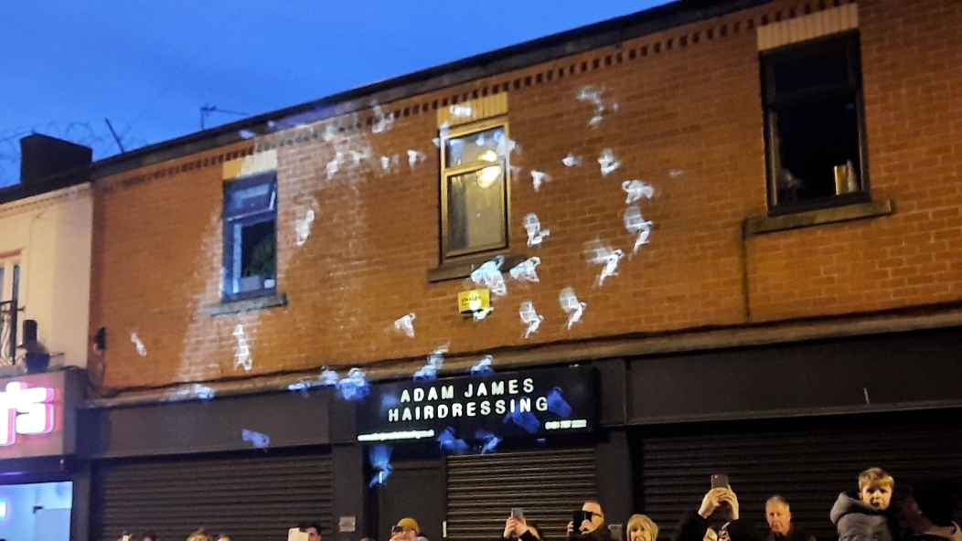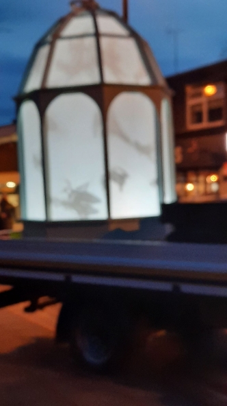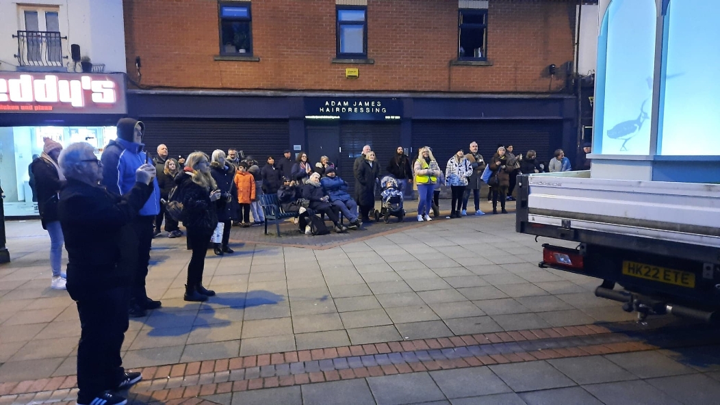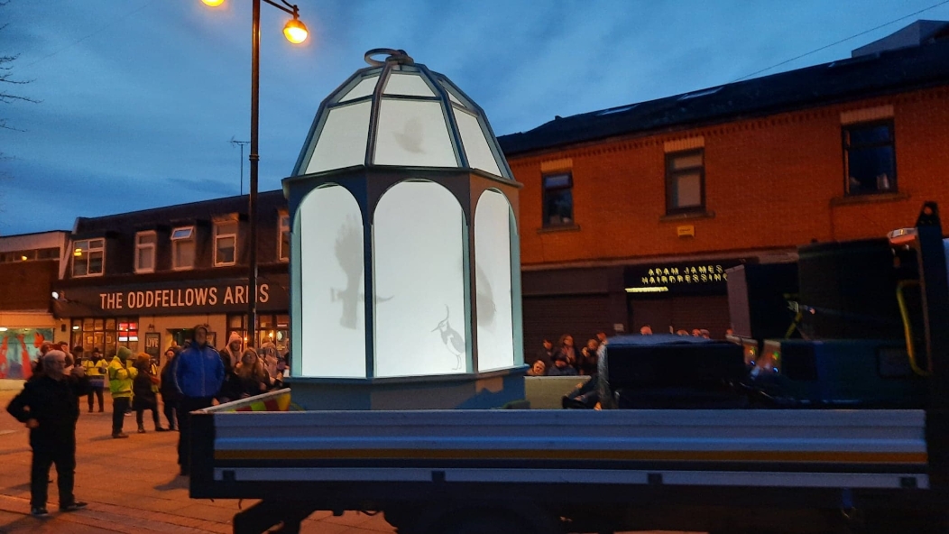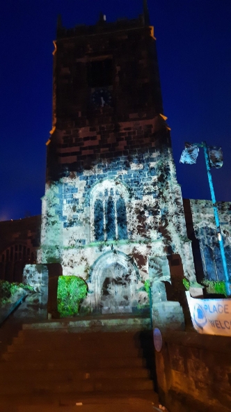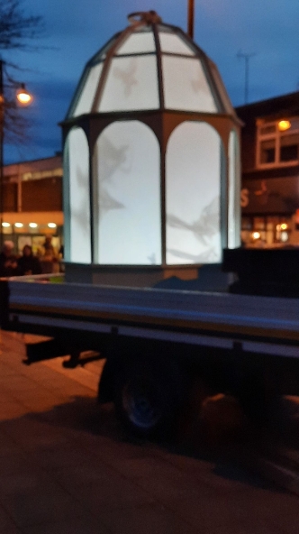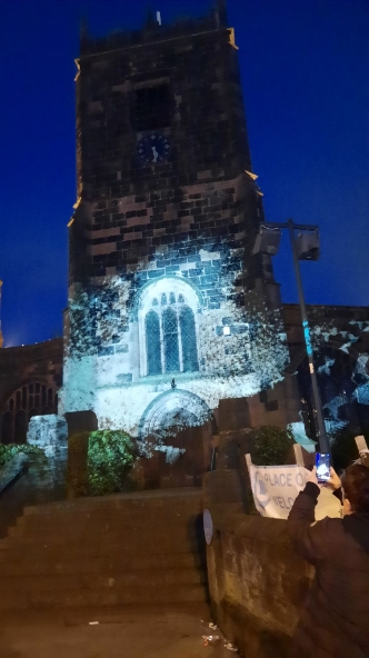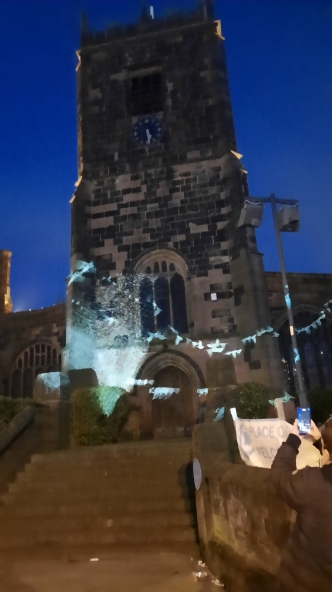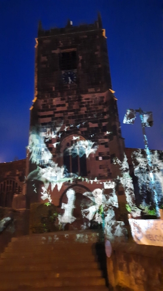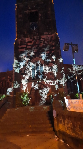 A crowd gathered outside Eccles Parish Church tonight all curious to see what the "Mystery Bird" show was all about, it had been seen around various locations in Eccles this week. The installation featured contributions from paper artist Helen Musselwhite, vocal artist Jason Singh, video projection artists Illuminos, local fabricators M3 Industries, and digital expert Jack Hardiker A huge birdcage on the back of a lorry parked outside the Church is suddenly illuminated and we see caged birds fluttering about as if eager to flee their confinement that is impressive enough. Then suddenly we hear a crash of music and the birds are released and projected onto the entrance of Eccles Parish Church, swooping and diving with even a murmuration of starlings flying over both the church and adjoining shops, giving a incredible display of flight and agility which had the crowds cheering for more. The whole show lasted 30 minutes and received a standing round of applause from those who had braved the cold to see the show and from what I could see all left happy. A thoroughly enjoyable show.
