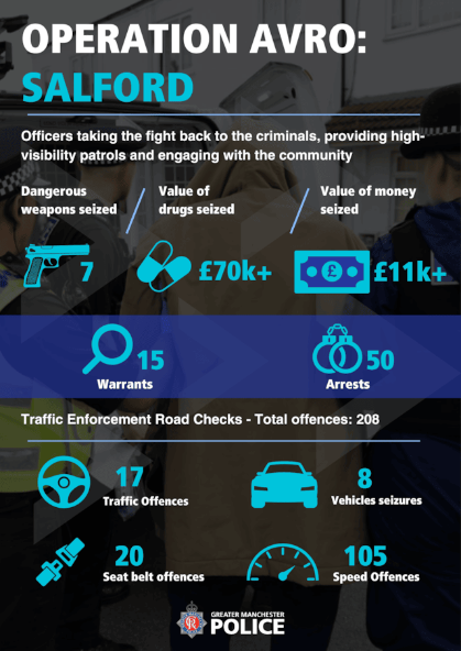 As part of GMP’s Operation Avro, a total of 50 offenders were arrested for a range of offences, including possession with intent to supply class A and B drugs, money laundering, theft, perverting the course of justice, assault and recall to prison. A traffic operation resulted in eight vehicles seized, 105 speeding offences recorded, 13 people caught using their mobile phone while driving and 17 fixed penalty notices for road traffic offences. In the afternoon, our mounted unit patrolled the Little Hulton area, while officers attended local schools to deliver inputs to students. AVRO is a force-wide initiative that delivers a surge of extra resources and specialist officers to a different district within Greater Manchester each month. The day saw GMP engage in a number of activities through proactive policework, tackling the issues which matter most to the community. Chief Inspector Gareth Humphreys, of our Salford District, said: What is Operation AVRO? Operation AVRO is a force wide initiative that delivers extra resources and specialist officers to a different district within Greater Manchester each month and launched in Salford in October 2021. Since then, it has travelled around the force with the operation targeting crimes and concerns that members of the public in that district have told GMP give them the most concern. For more information, visit: Operation AVRO | Greater Manchester Police (gmp.police.uk)